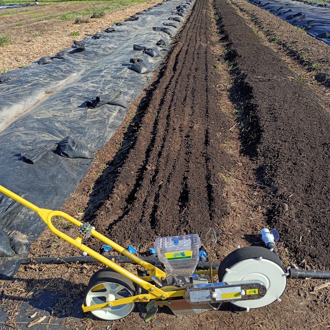 The Jang Seeder is a precision seeder used on the market-garden scale to make direct seeding much more efficient. There is a series of cogs and wheels (and a brush) that work in concert to make this handy little machine a easy walk behind seeder for seeding rows quickly.